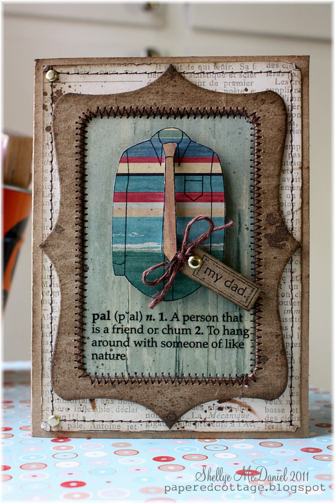 Super, super quick and easy using my Sizzix die to create the chipboard frame. I then distressed it with walnut ink, spritzed with a little gold Smooch Spray. For the shirt, after stamping and cutting it out, I applied it to the card using foam dots. I then stamped another image and cut the tie out; added it with pop dots. Of course, a piece of paper can't get away from me without being stitched on hee hee hee hee