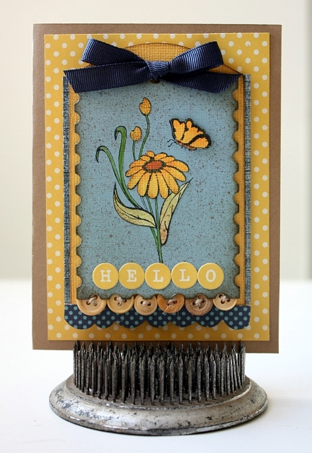 with a felt doily (cut in half), a burlap butterfly and a sentiment that I stamped and then trimmed from a white library card. I think these would be so cute tucked in a wicker basket for all of the guests to fill out.