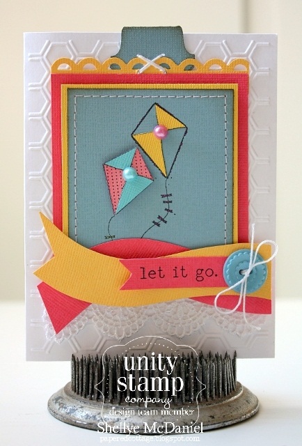 This card includes all sorts of pretties from the shop: shabby chic scallop flowers, polka dot embossed shipping tags, glitter embellishments and dyed doilies. After stamping on the tag (non-embossed side) I tucked it into a vintage library pocket, also found at Curtsey Boutique.